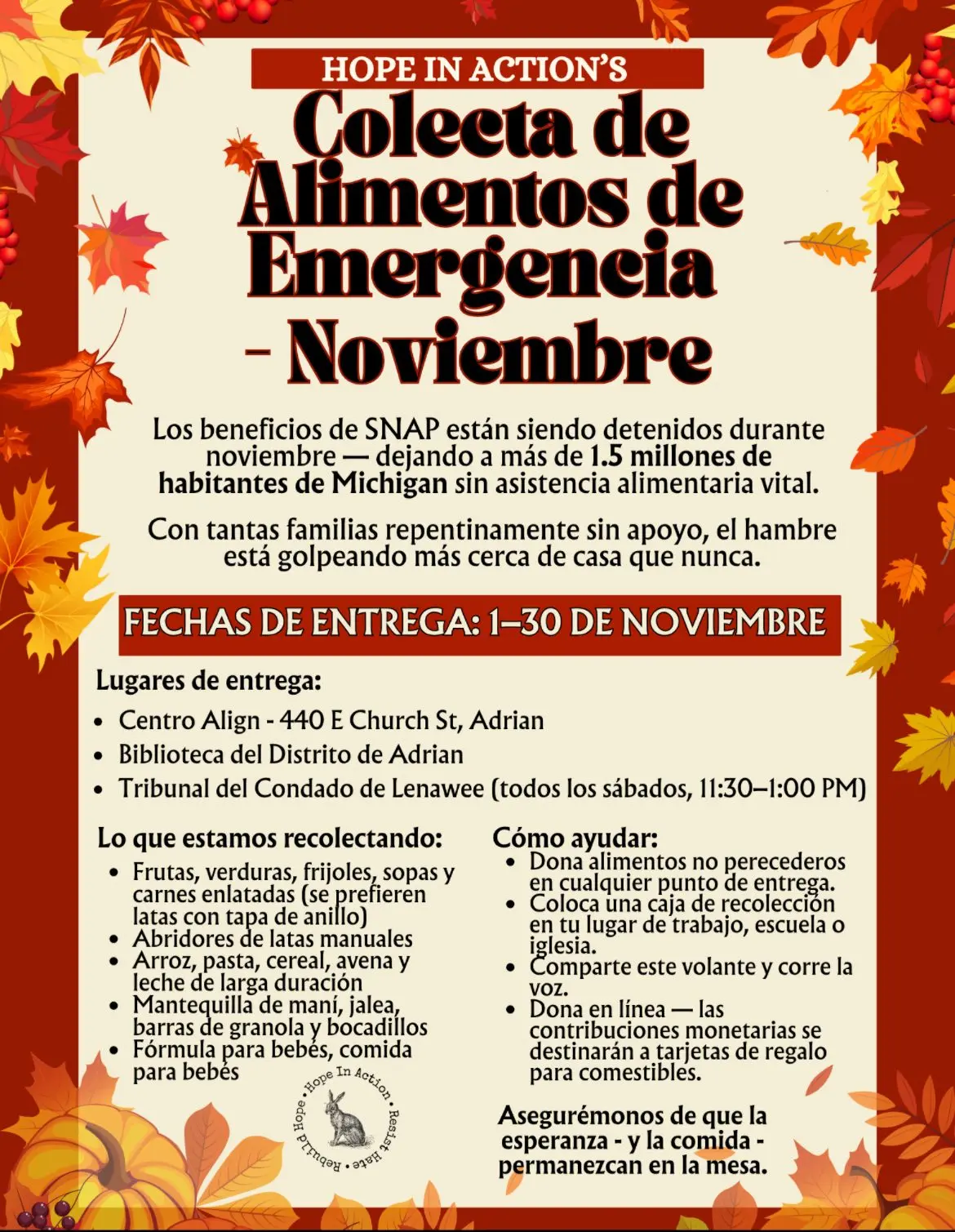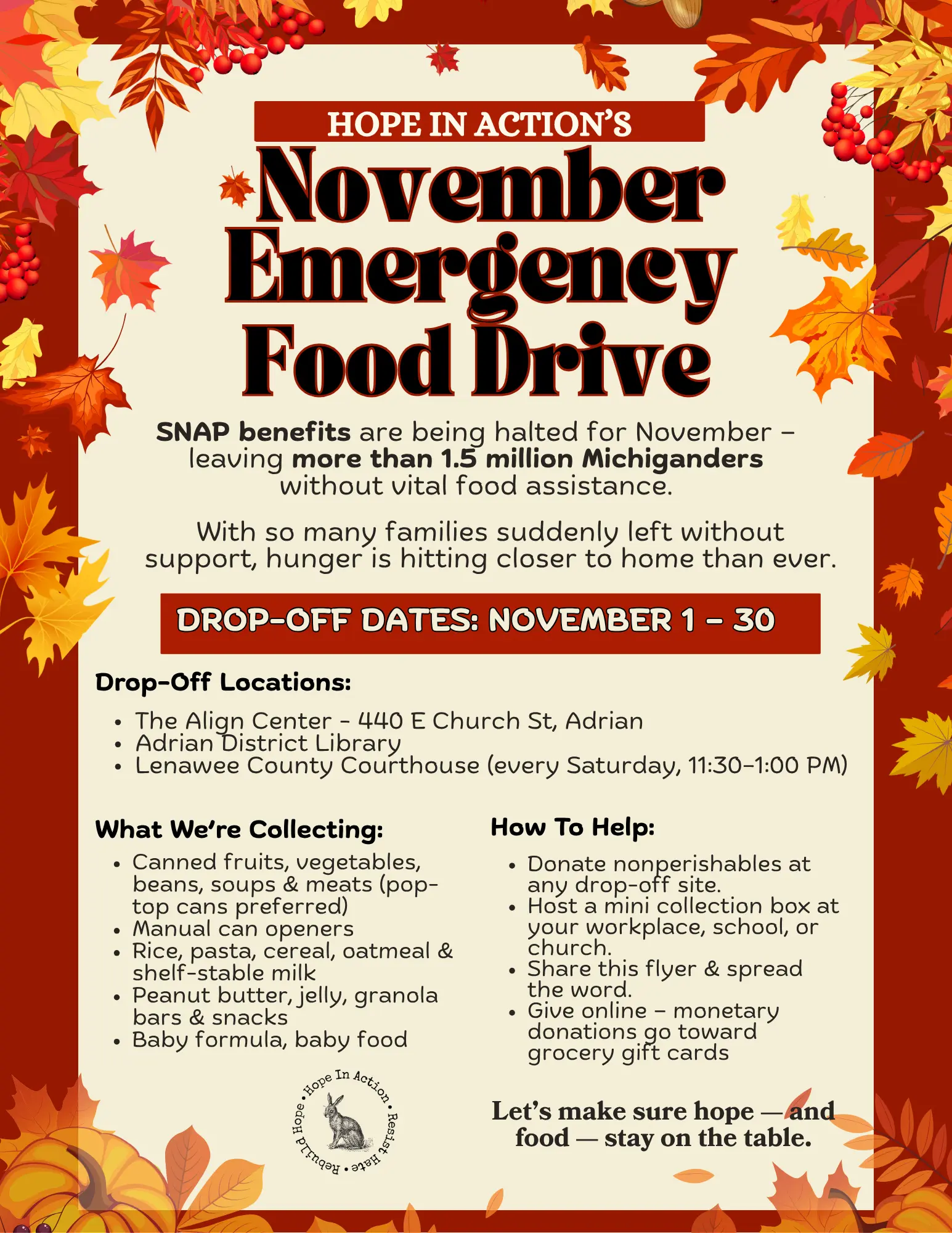 The November Emergency Food Drive runs through November 30. Drop-off locations include The Align Center on East Church Street, the Adrian District Library, and the Lenawee County Courthouse each Saturday from 11:30 to 1 p.m.